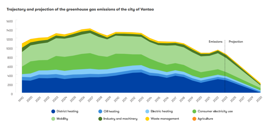 It is Vantaa’s goal to become a carbon-neutral city by 2030. Vantaa’s regional greenhouse gas emissions have been decreasing since 2010. The exceptions are the years 2021 and 2022, during which emissions increased mainly due to district heating production.