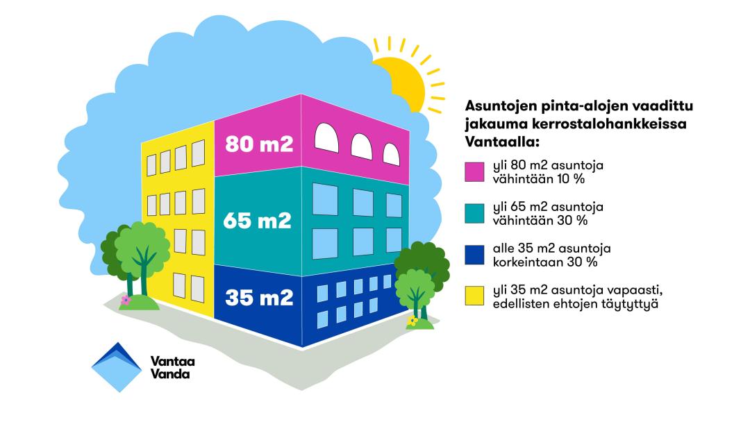 In the city's own land allocation and in land allocation competitions, the requirements for regulating the floor area of apartment buildings or other dwellings may be stricter than the above conditions, for example, the minimum number of square metres may be increased or the percentage of larger dwellings may be increased. Such exceptions will be submitted as proposals for decision to the City of Vantaa's municipal premises committee.