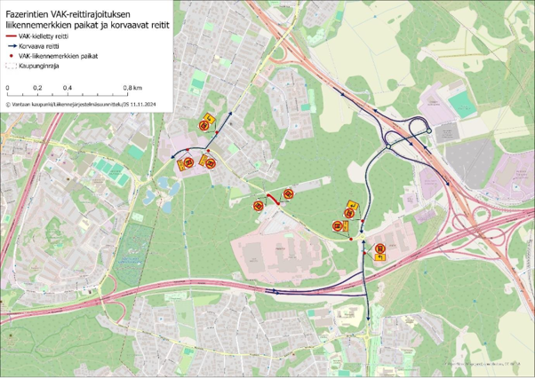 The restriction is based on the protection zone regulation of the Fazerila groundwater area. There are well-established alternative routes to the industrial areas along Fazerintie, which have been in use for several years. Signage locations and replacement routes are clearly marked to ensure safe and efficient traffic flow.
