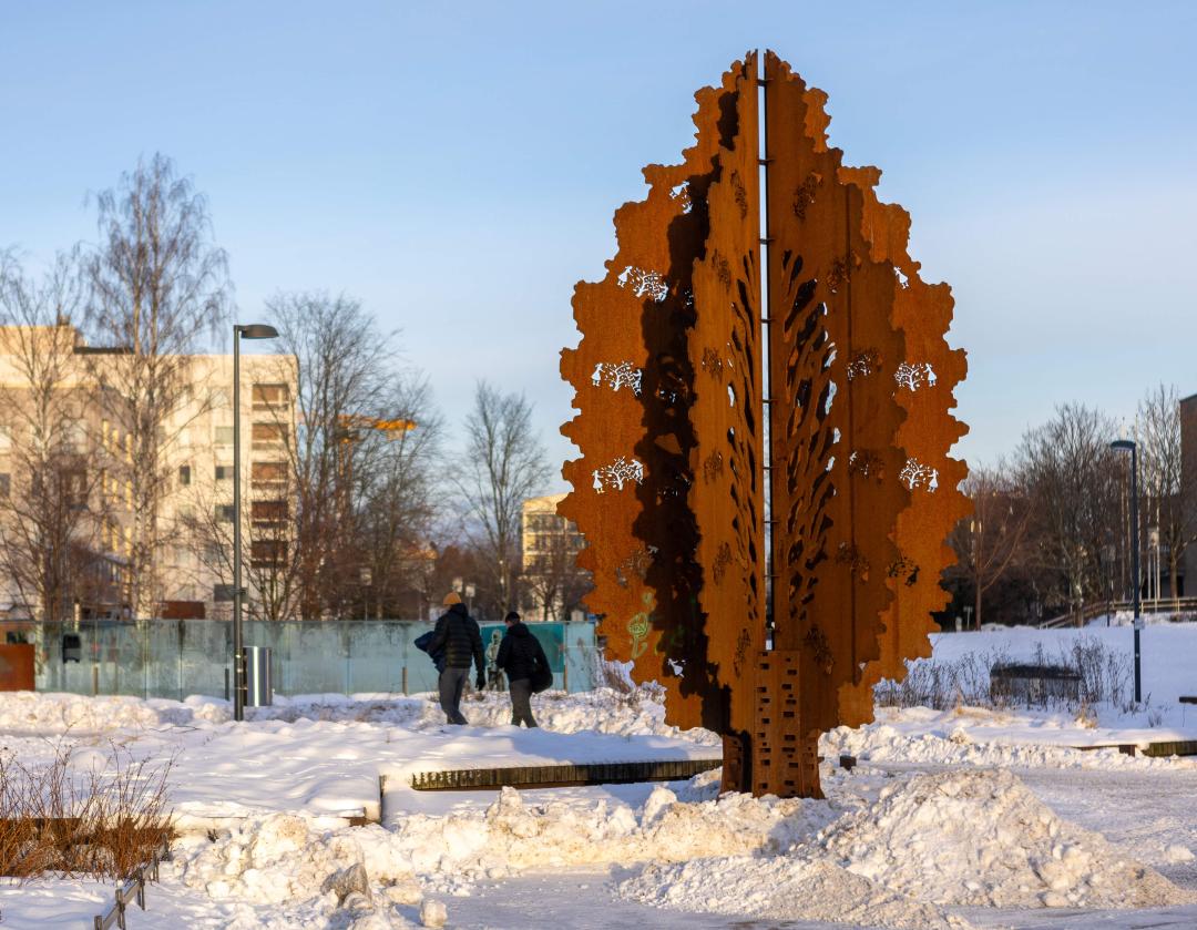 Joko tutustuit vaikkapa Tikkurilan julkisen taiteen reittiin? Kuvassa talvinen Tarinapuu Tikkurilassa. Lue lisää Merja Rankin teoksesta Artsin sivuilta.