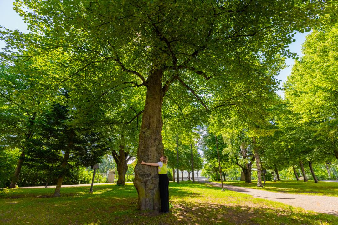 Etsi siis sopiva puu vaikka lähiluonnostasi ja kiedo kätesi sen ympärille rutistukseen! Kuvassa näkyvä puu kasvaa Tikkurilan veteraanipuistossa.