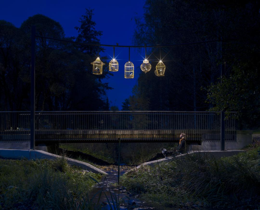 Yksi uusista taideteoksista on Vantaan 50-vuotisjuhlavuonna julkistettu Kultainen häkki. Jokiuomanpuiston lintuteema täydentyi taiteilija Johanna Ilvessalon ja vantaalaisten esikoululaisten yhdessä tekemällä ympäristötaideteoksella. Kuva: Sami Parkkinen