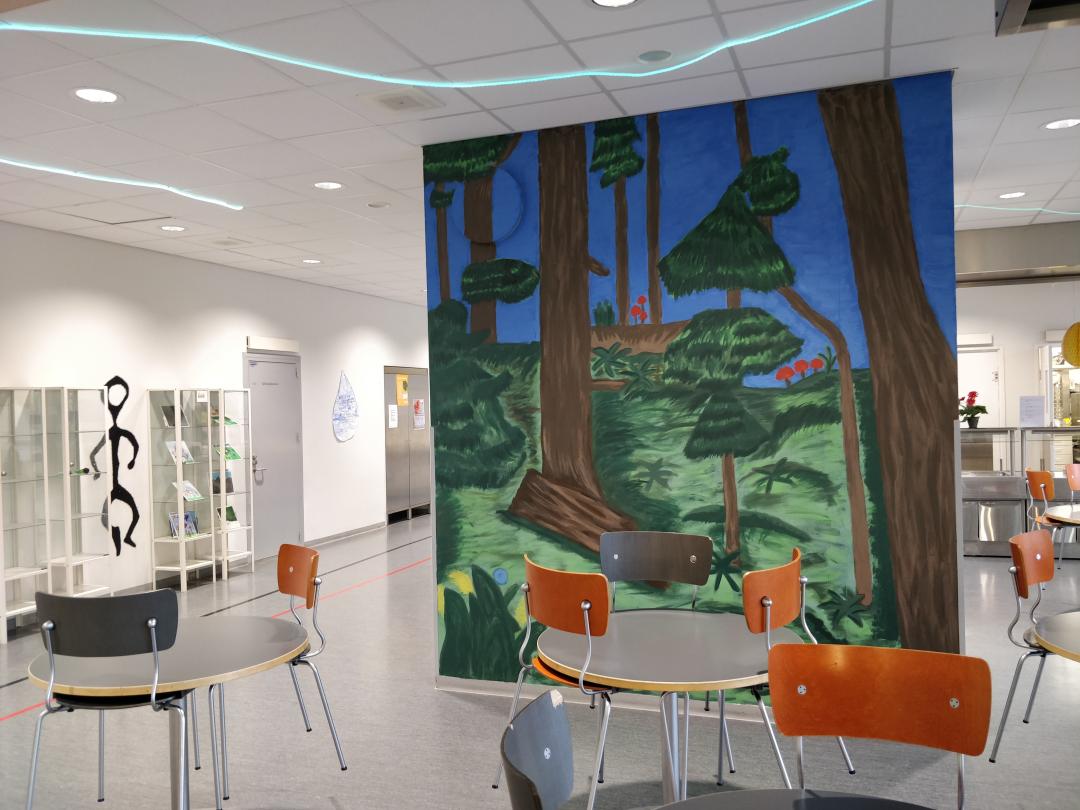 Rekolanmäen koulun ruokalassa on ympäristöteemainen seinämaalaus, joka on valittu ympäristöagenttien kanssa.