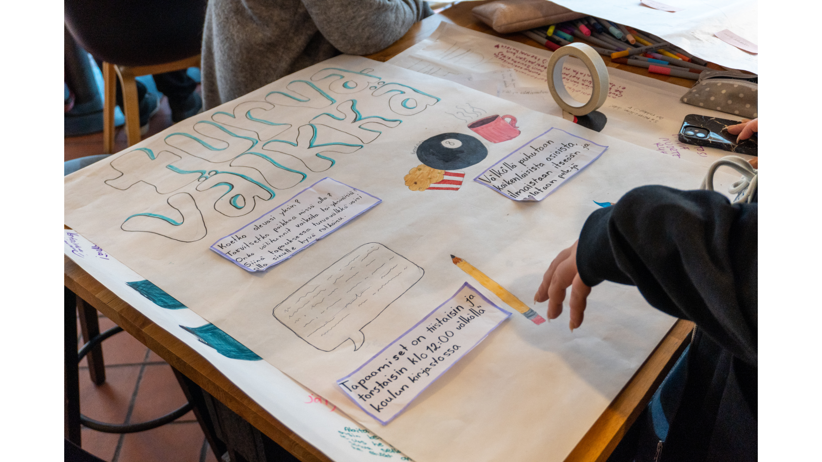 Ideoiden toteutuminen näyttää lupaavalta, sillä ryhmät saivat tilaisuudessa itselleen jo yhteistyökumppaneita, joiden avulla ideoita voidaan lähteä toteuttamaan käytännössä! Elinan ja Alinan ryhmä oli ideoinut Syrkkä-ryhmän, jonka tuella ehkäistään syrjäytymistä ja kaikki voivat löytää kavereita. Miten idean toteutus käynnistyy?
