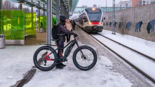 Eero Happonen valokuvasi työmatkalaista, joka kulkee pyörällä ja lähijunalla Vantaalta Helsinkiin. Kuva on Leinelän rautatieasemalta 28.2.2024 klo 7.42. Kuva: Eero Haaponen / Vantaan kaupunginmuseo