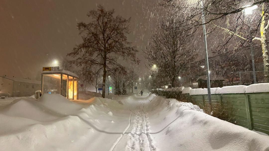 Laura Helminen dokumentoi omaa työmatkaansa Martinlaaksosta Helsinkiin. Luminen Martinlaaksontie tallentui matkalla juna-asemalle 18.1.2024 klo 6.51. Kuva: Laura Helminen / Vantaan kaupunginmuseo