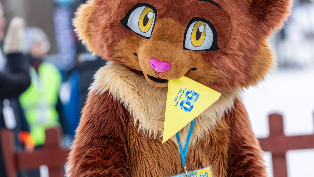 Lastenkulttuurikeskus Pyykkituvan maskotti Chiro kannusti kilpailijoita hiihdon Suomen mestaruuskilpailuissa urheilupuistossa vuonna 2024.