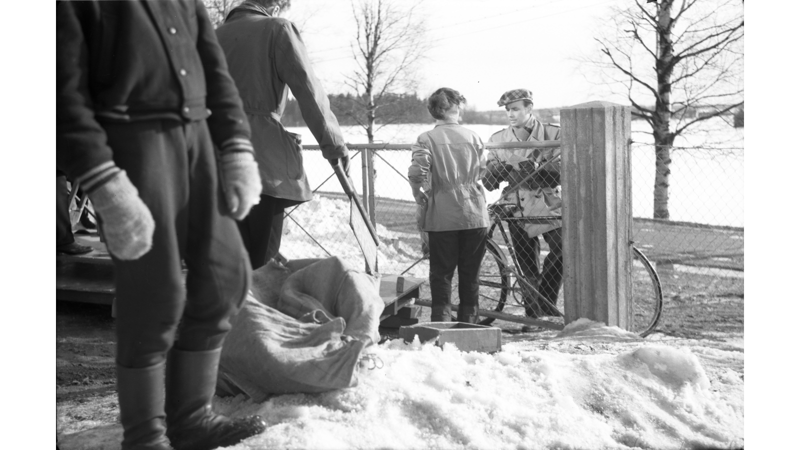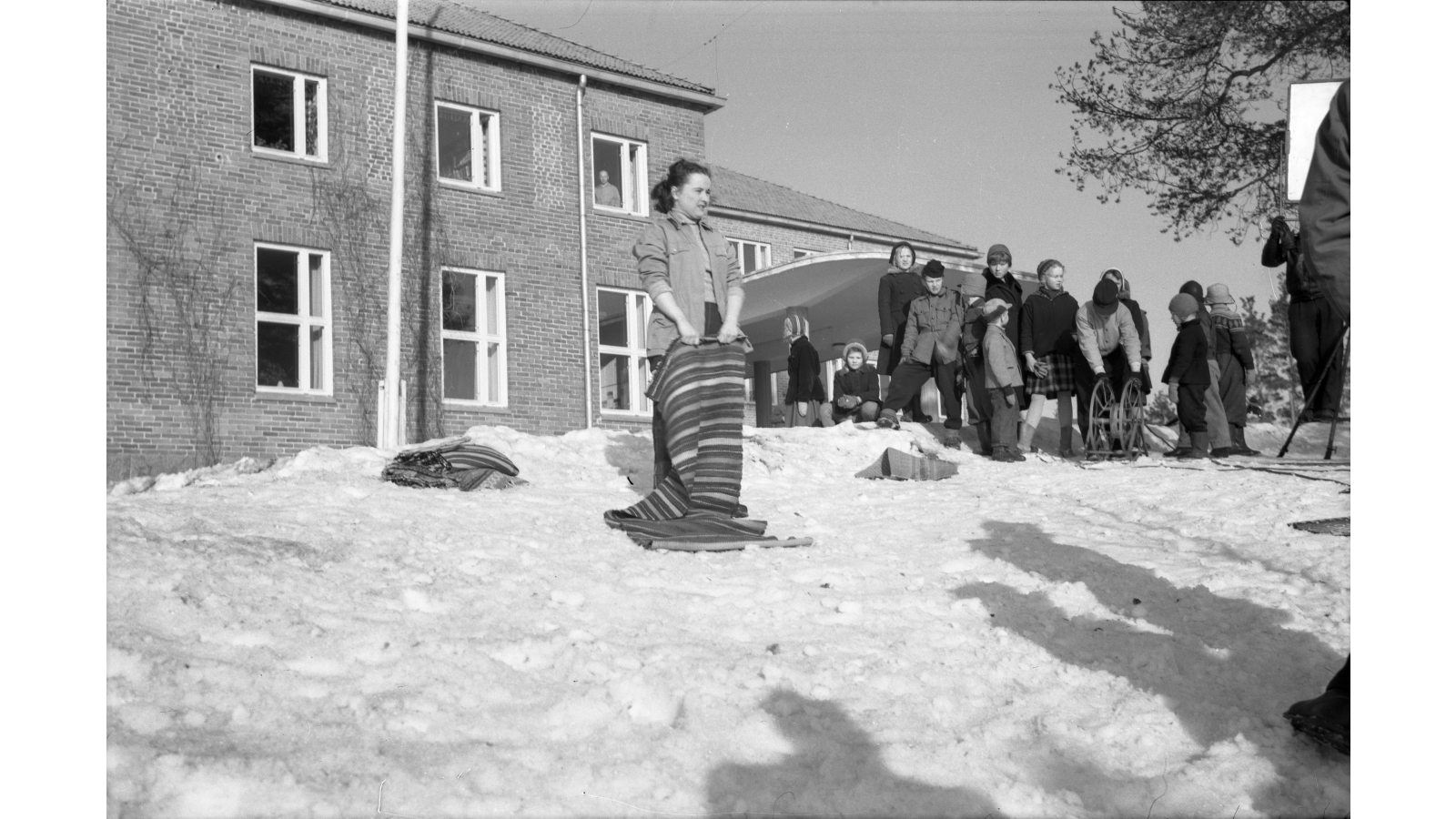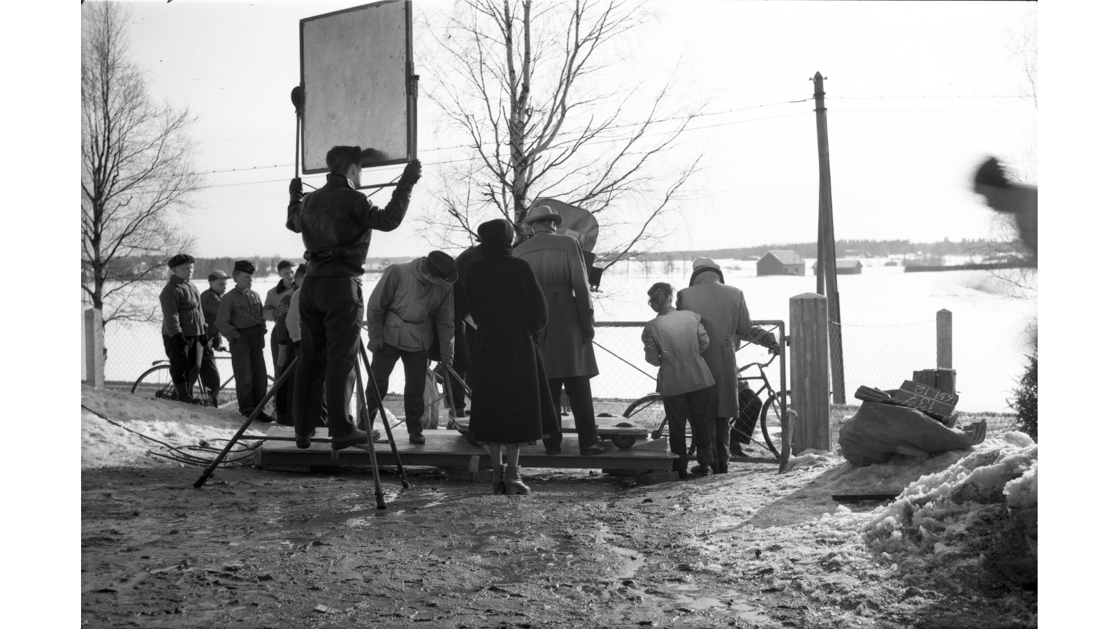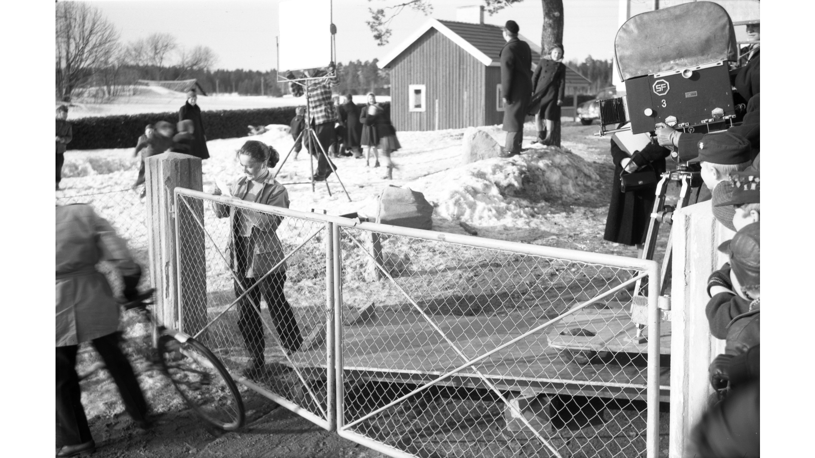 Neiti talonmies -elokuvan kuvaus Veromiehen koululla vuonna 1955. Pääosan näytteli Nelly Lovén ja elokuvayhtiönä toimi Suomen Filmiteollisuus (SF). Kuva: Lauri Leppänen, 1955, Vantaan kaupunginmuseo