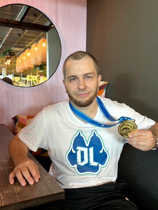 Vantaalainen Marko Liimatainen säteilee tyytyväisyyttä esitellessään kultamitaliaan. Hän oli mukana pelaamassa Suomen kuurojen jääkiekkomaajoukkueessa, kun he voittivat Vancouverissa Kanadassa järjestetyt MM-kisat toukokuussa.