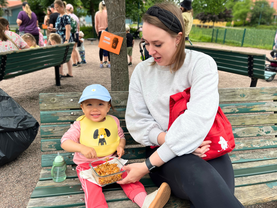 Yksi näistä tuhannesta annoksesta on päässyt kaksivuotiaan Ellenin lautaselle. Ellenin äiti Julia Kyyhkynen-Nguyen kehuu, että puistoruokailusta löytyy aina kavereita.