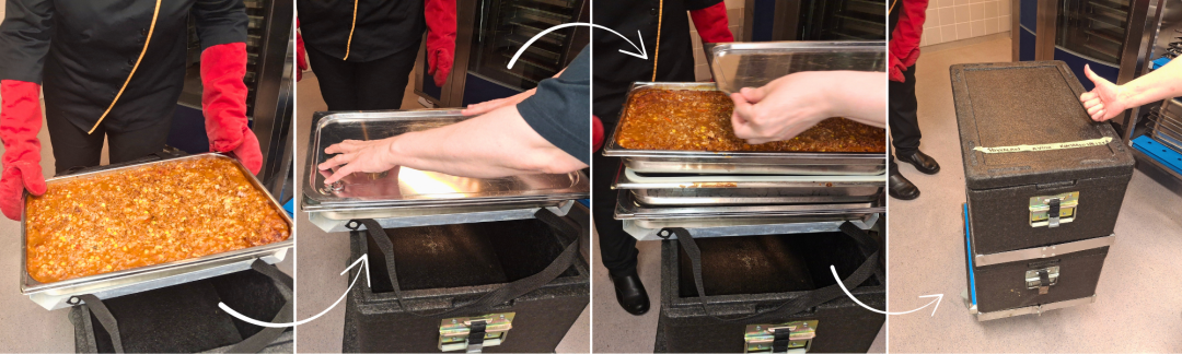 Sitten lasagnette on päässyt uunin kautta lämpölaatikoihin ja niissä kuljettaja Jarmon autoon. Puistoruoka matkustaa kahdessa autossa puistoihin. Ne lähtevät keittiöltä aamulla yhdeksän jälkeen.