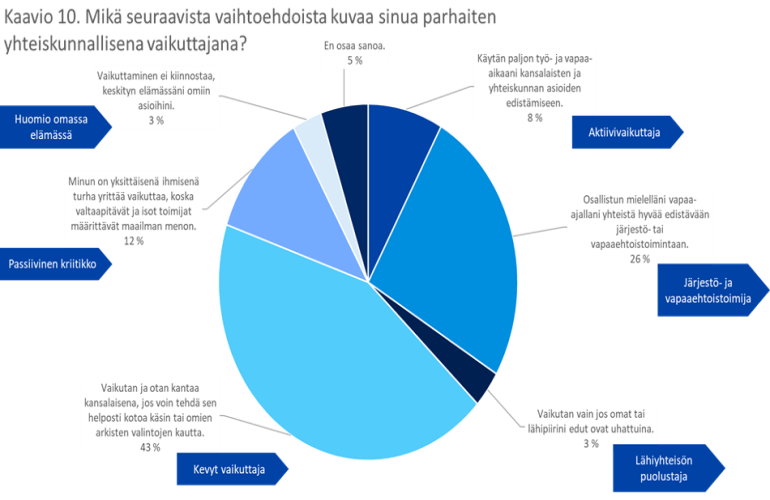 Yli 40 % vastaajista identifioi itsensä ns. kevytvaikuttajaksi, eli he ovat valmiita vaikuttamaan ja ottamaan kantaa, jos he voivat tehdä sen helposti kotoa käsin. Matalan kynnyksen osallistuminen korostui myös muiden kysymysten vastauksissa laajasti. Osallistuminen koetaan motivoivammaksi, mikäli se on helppoa. Verkkokyselyt ja -tilaisuudet, selkeät osallistumisprosessit ja konkreettiset vaikuttamisen kohteet nousivat useissa vastauksissa esille osallistumista helpottavina tekijöinä.