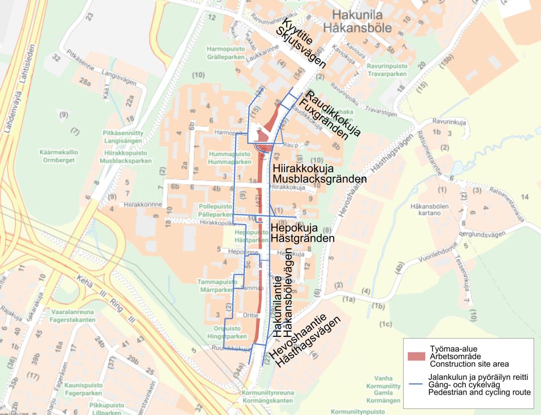 Alla olevassa kartassa esitetty työmaa-alueet ja jalankulun ja pyöräilyn reitit.