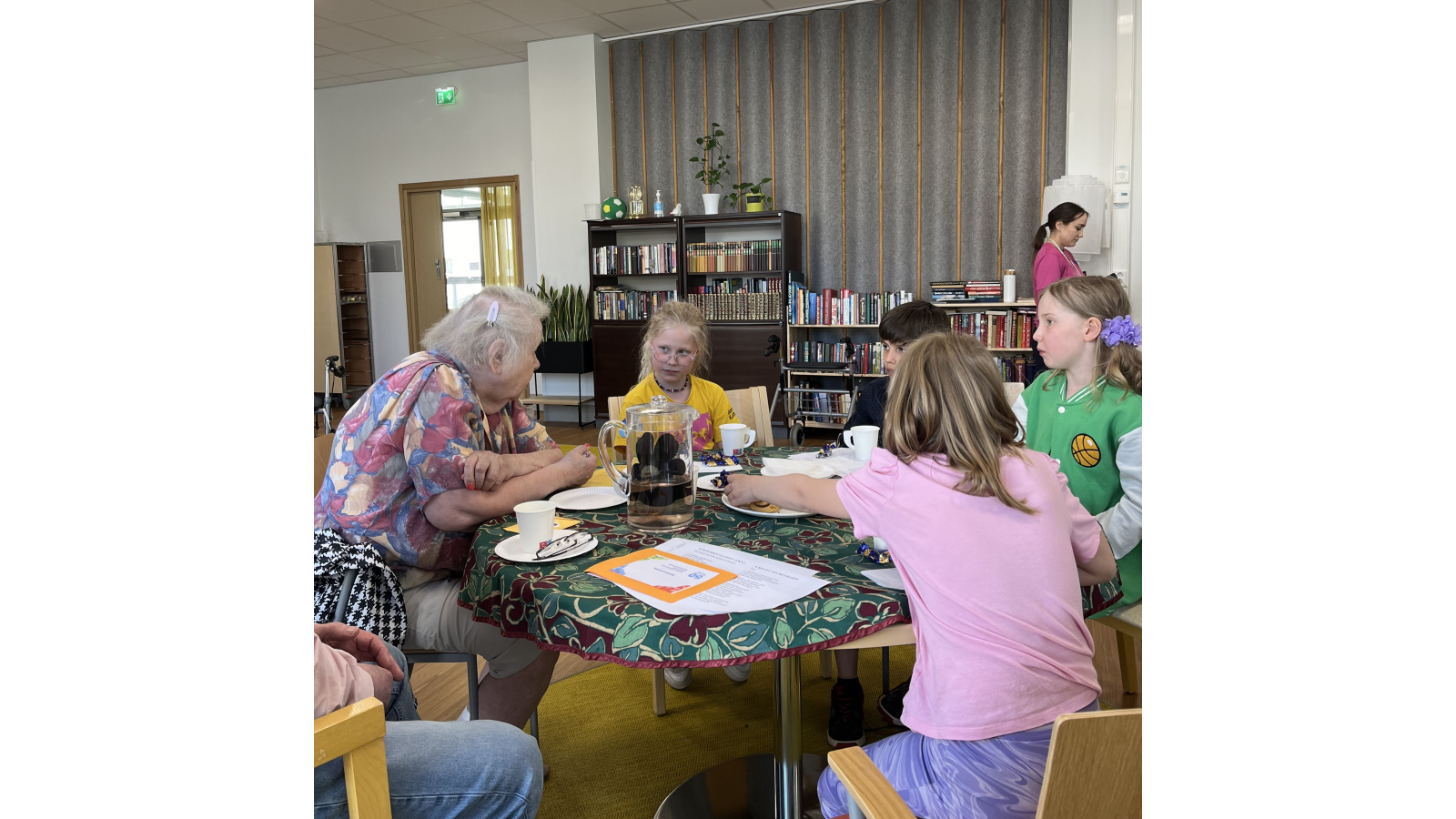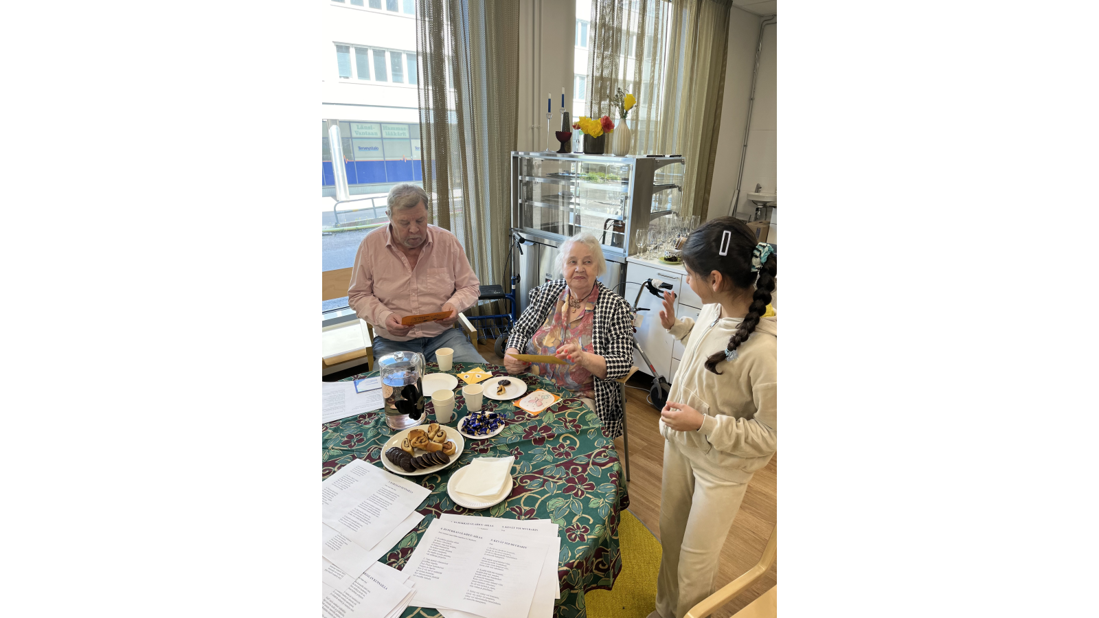Korttien jakamisen lomassa herkuteltiin kekseillä ja mehulla. Kävimme seuraamassa lasten ja vanhusten välistä keskustelua, joka keskittyi sekä omaan asuinalueeseen että koko Vantaaseen.
