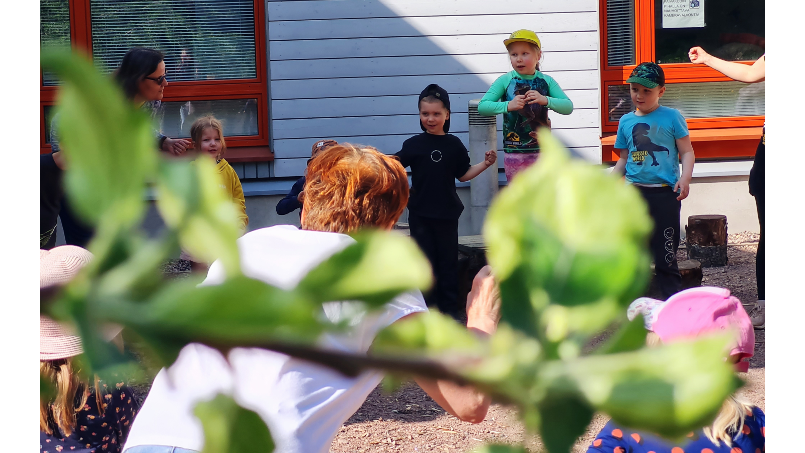 Siimapuiston päiväkodin lapset leikkivät kasvisaiheista laululeikkiä päiväkodin puutarhassa. Lasten suosimalla leikillä oli tällä kertaa erityinen vetäjä: leikin luonut Pilvi Liikkanen.