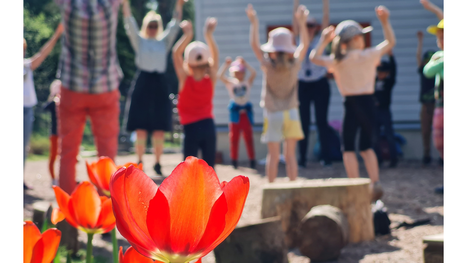 Aurinko ja lapset hymyilevät kilpaa Siimapuiston päiväkodin puutarhassa toukokuisena maanantaiaamuna. Hymyyn on hyvä syy: aamun ohjelmassa on kasvisaiheinen leikki.
