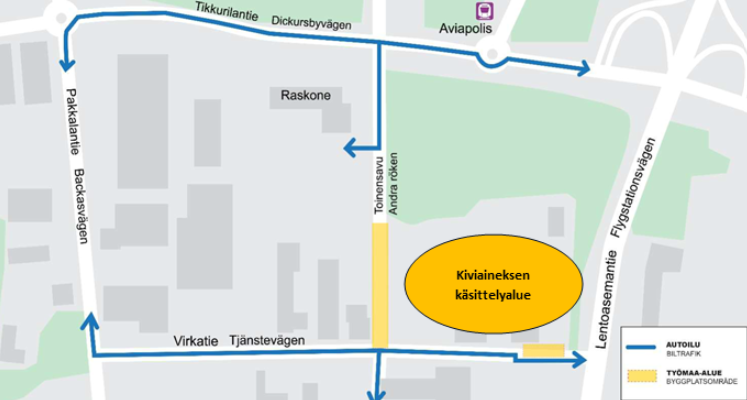 Vantaan ratikan työt etenevät Aviapoliksen ympäristössä. Seuraavaksi aloitamme kiviaineksen käsittelyn alueella. Käsittelyalueen sijainti on merkitty karttaan oranssilla.