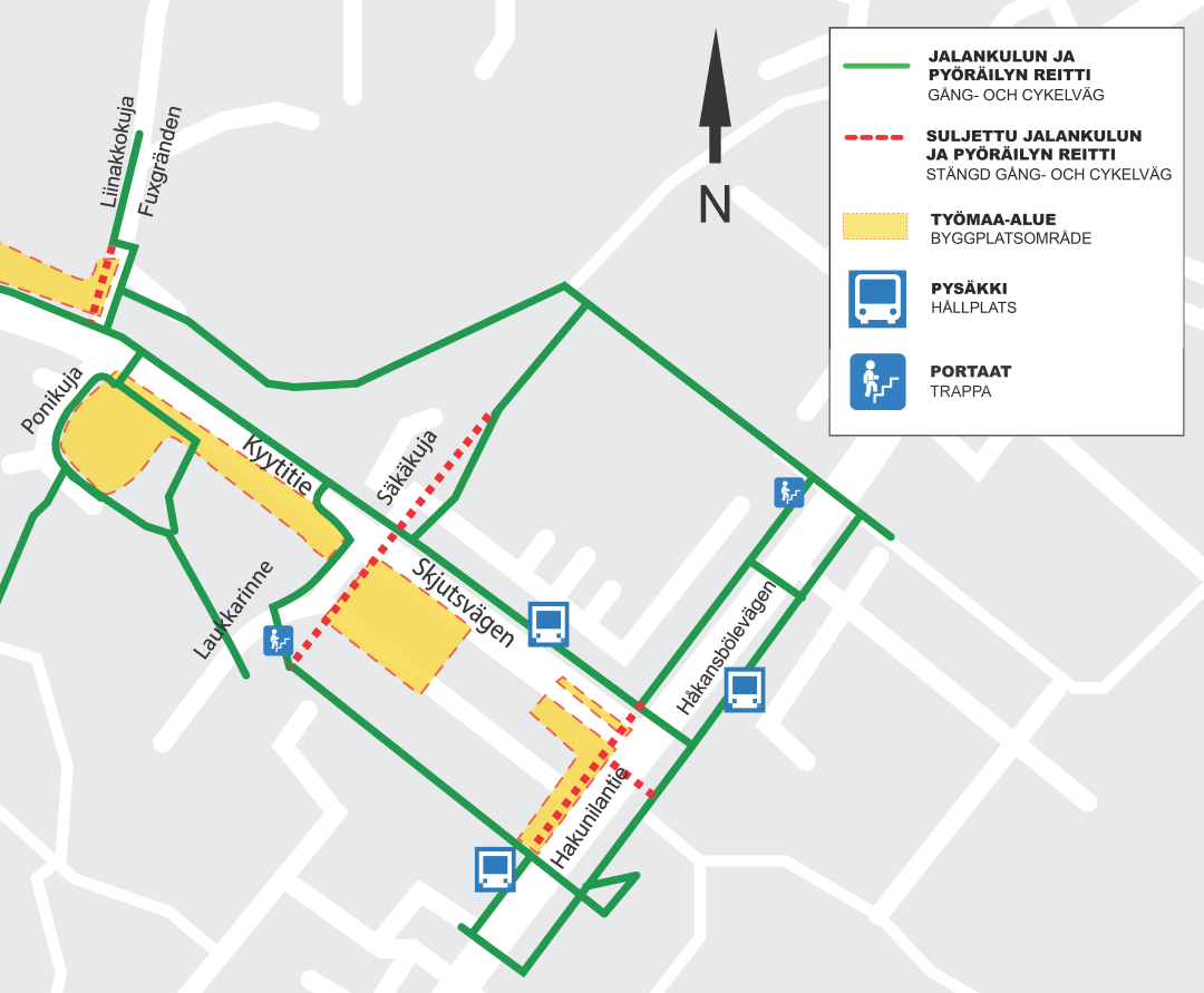Kyytitien ylittävän Hakunilanraitin sillan purkutyöt alkavat aiemmin tiedotetusta poiketen keskiviikkona 22.4. Jalankulku ja pyöräily sillan kohdassa ohjataan kiertoreiteille. Alueelle on viety kiertoreiteistä kertovat opasteet. Järjestelyihin saattaa tulla pieniä muutoksia työmaan edetessä.