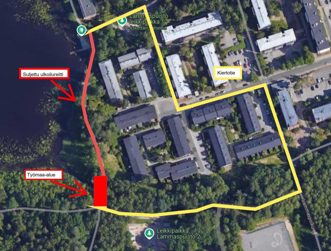 Sillan lisäksi osuus lammen kiertävästä ulkoilureitistä Lammaspuiston leikkipaikkojen välillä on suljettu kunnostuksen ajan. Kiertoreitti on merkitty alueelle opasteilla.