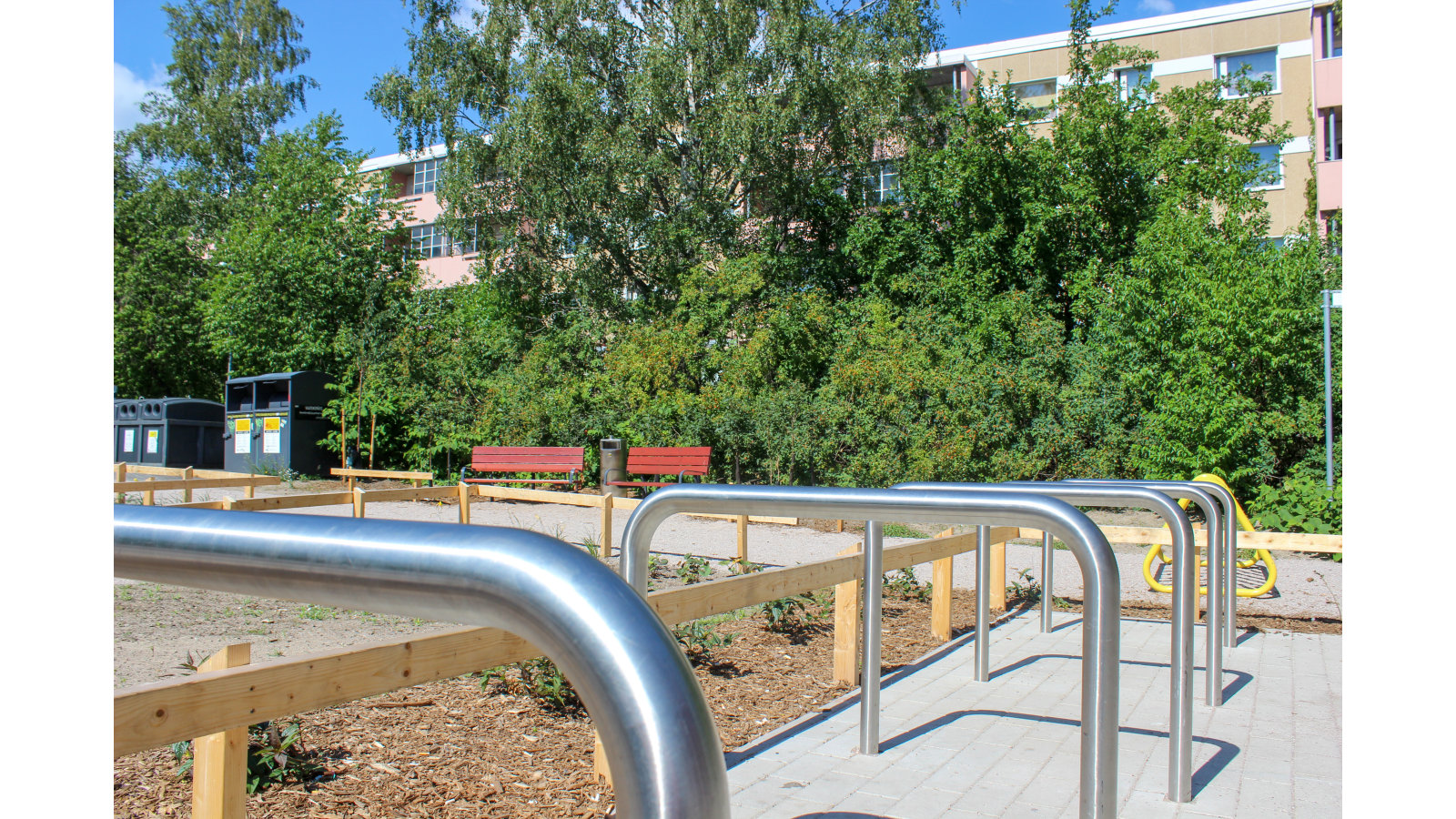 Nyt valmistuneelle aukiolle on asukkaiden ideoiden mukaisesti tehty kiveys, asennettu penkit, roska-astia ja runkolukittavia pyörätelineitä sekä lisätty istutuksia.