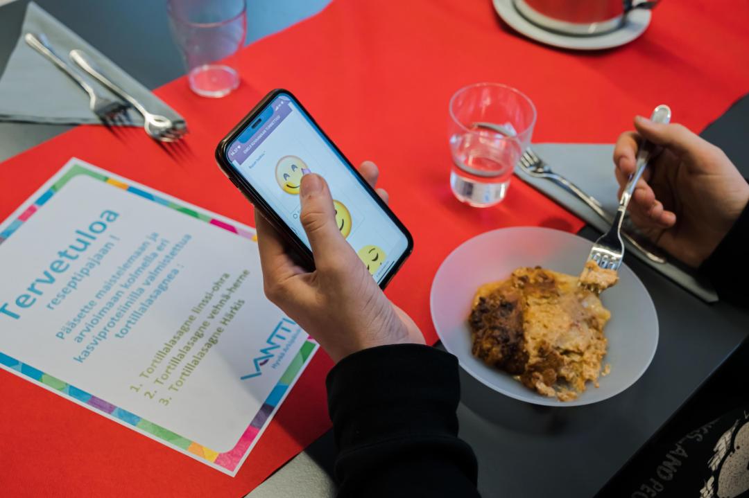 Ruusuvuoren koululla ysiluokkalaiset maistelivat ja arvioivat aistinvaraisesti tortillalasagnea kolmella eri kasviproteiiniversioilla. Aistinvaraista arviointia tehtiin samalla sujuvasti täyttämällä arviointilomaketta kännykällä. Kuva: Vantaan kaupunki/Sercan Alkan.