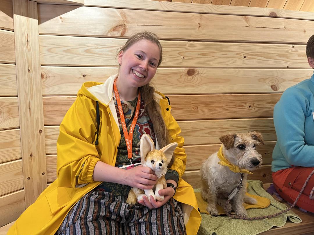 Erikoiskirjastonhoitaja Emily Hallfast iloitsi lukukoirien ensimmäisestä vierailusta puistoruokailussa.