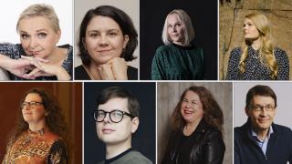 Kuvassa järjestyksessä vasemmalta oikealle: Raija Oranen / kuva: Heli Sorjonen, Irene Zidan / kuva: Otto Virtanen, Elisa Aaltola / kuva: Suvi Elo, Saara Turunen / kuva: Antti Haanpää, Ann-Christin Antell / kuva: Liisa Valonen, Juhani Karila / kuva: Laura Malmivaara, Leena Lehtolainen / kuva: Sabrina Bquin, Markus Nummi / kuva: Sabrina Bquin
