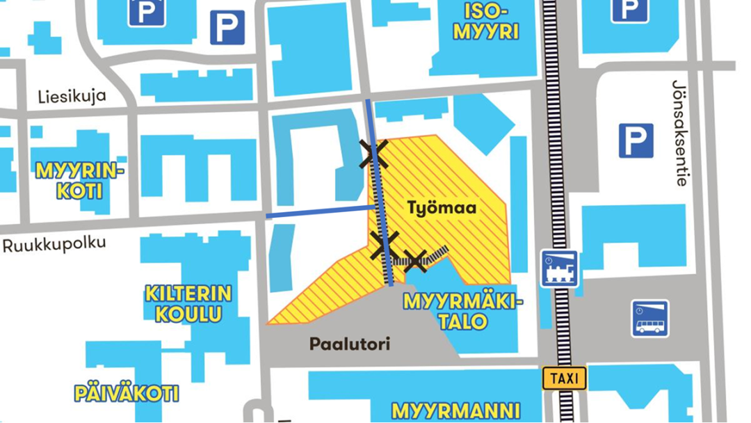 Myyrmäen keskustassa junaradan länsipuolella on viime vuosina rakennettu uusia asuin- ja liikekortteleita. Työmaat ovat rajoittaneet kulkua. Katuja on voitu avata sitä mukaa kun rakennustyöt ovat edenneet.