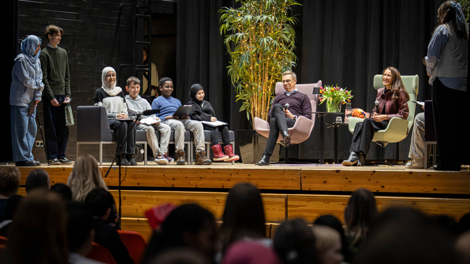 Koulun oppilaat pääsivät kysymään presidenttiparilta kysymyksiä. Esimerkiksi seuraavan: mikä muuttui sen jälkeen, kun Alexander Stubbista tuli presidentti?
