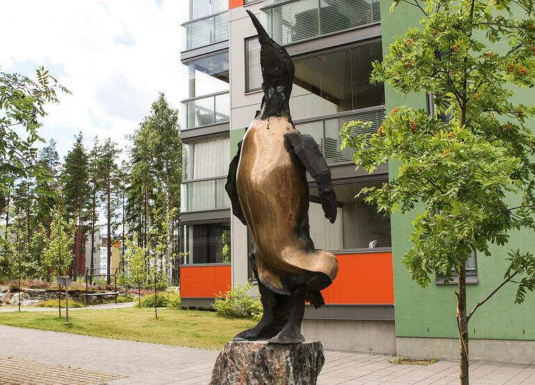 Leinelän asuinalueella taide ilahduttaa monipuolisesti. Kuvassa Heimo Suntion pronssiveistos.