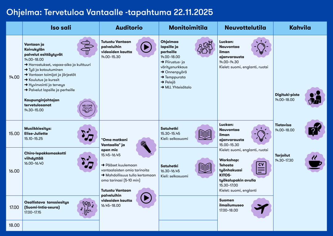 Oletko muuttanut Vantaalle hiljattain? Haluatko tietää lisää palveluista lähellä kotiasi ja tavata muita uusia vantaalaisia? Ilmoittaudu ja tule mukaan Tervetuloa Vantaalle -tapahtumaan lauantaina 22.11.2025!