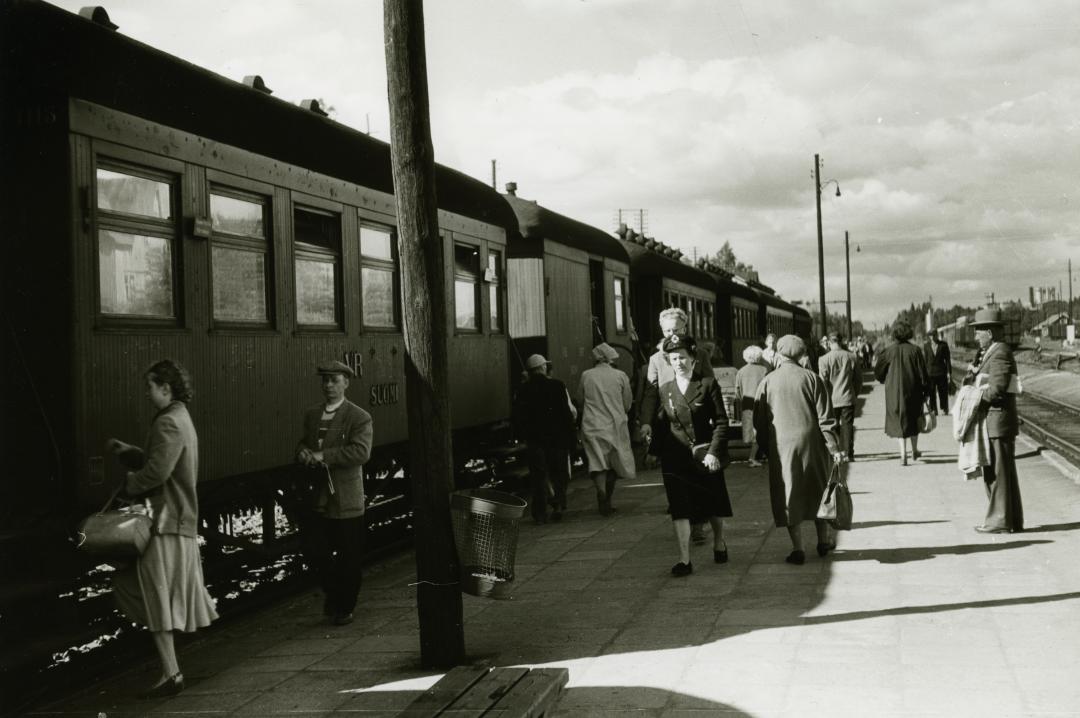 Juna Tikkurilan asemalla vuonna 1958, keskellä konduktööri virkapuvussaan. Kuva: Lauri Leppänen, Vantaan kaupunginmuseo.