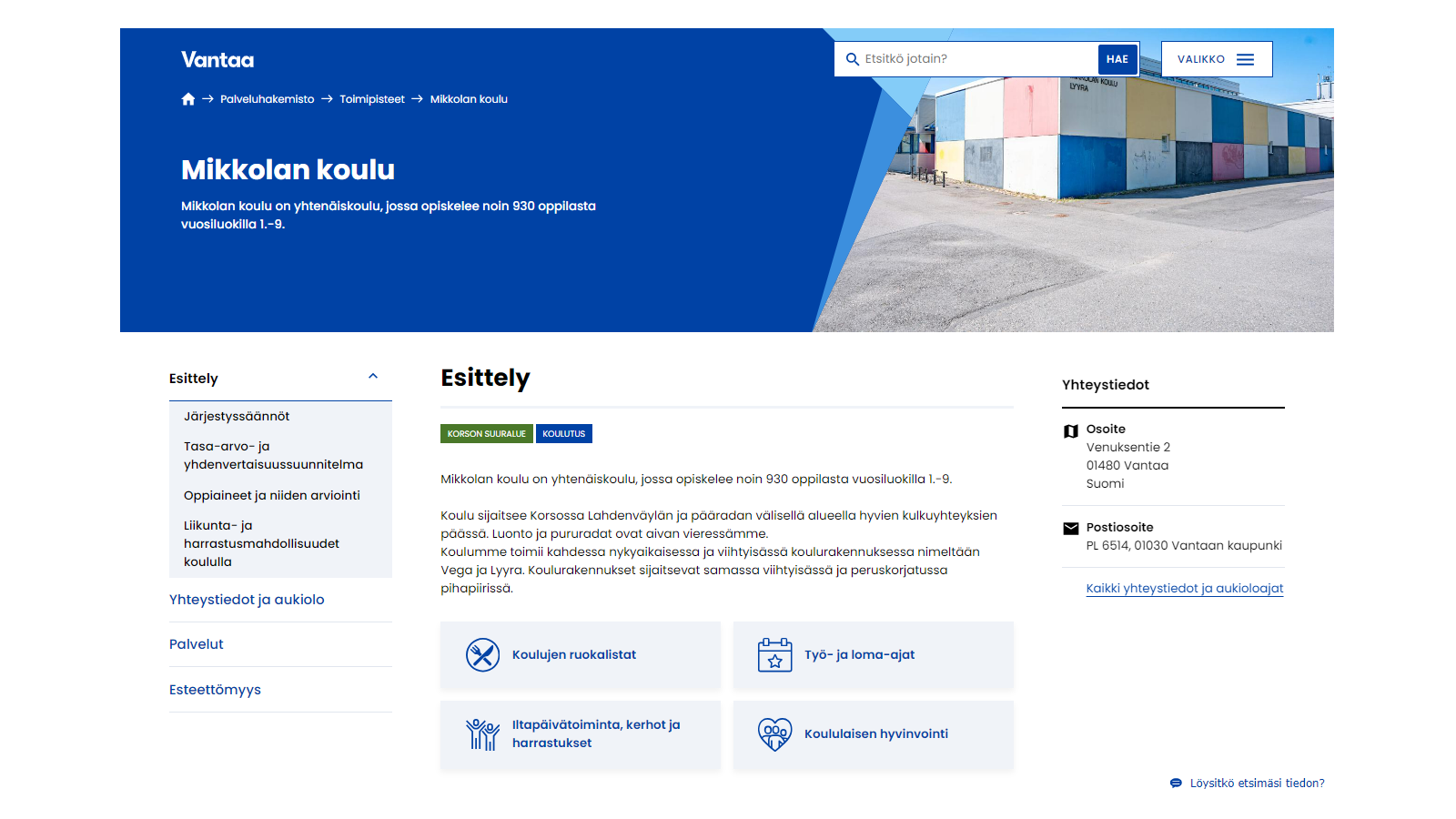 Uusi vantaa.fi-sivusto on nyt ollut käytössä noin vuoden. Saatujen kokemusten ja palautteiden perusteella toimipiste- ja palvelutietojen esittämistapa päätettiin uudistaa niiden käytettävyyden parantamiseksi. Uusi esitystapa julkaistaan sivustolla 27.4.2023.