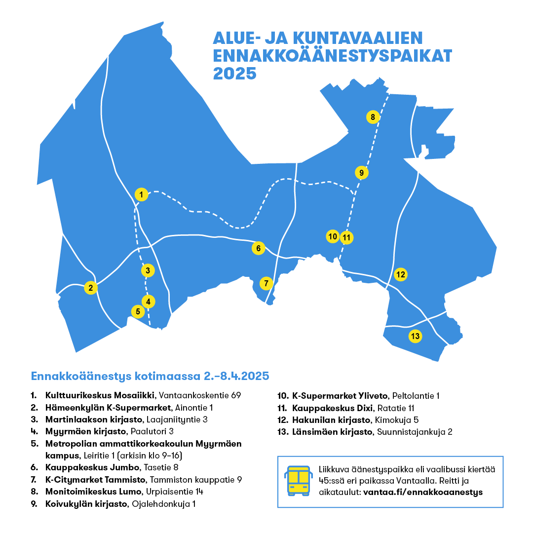 Vantaan ennakkoäänestyspaikat ja vaalibussin aikataulu: vantaa.fi/ennakkoaanestys