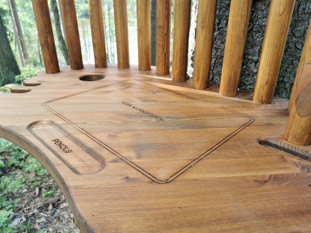 Työpisteiden muotoilussa yhdistyy puiden pyöreys ja luonnon hengittävyys, joiden myötä ne sulautuvat osaksi luontoa. Ulkoetätyöpiste on suunniteltu vastaamaan kävijöiden erilaisiin tarpeisiin: niistä löytyy puhelin- ja mukiteline, alue työkoneelle, syvennys kynille sekä mahdollisuus ripustaa laukku. Etätyöpisteet on kiinnitetty liinoilla, jotka eivät vahingoita puuta.
