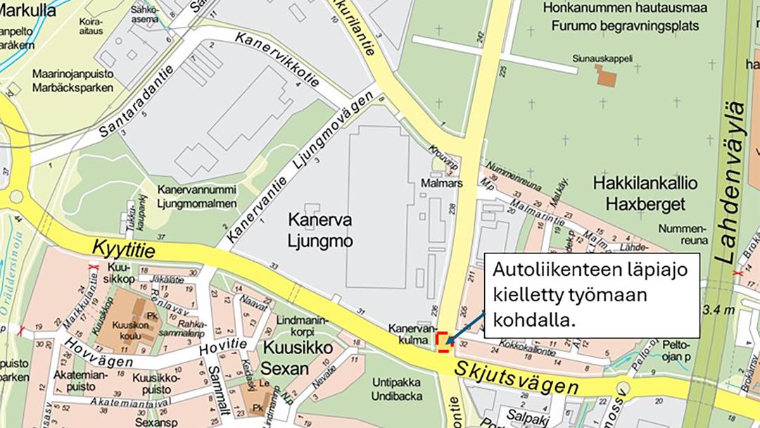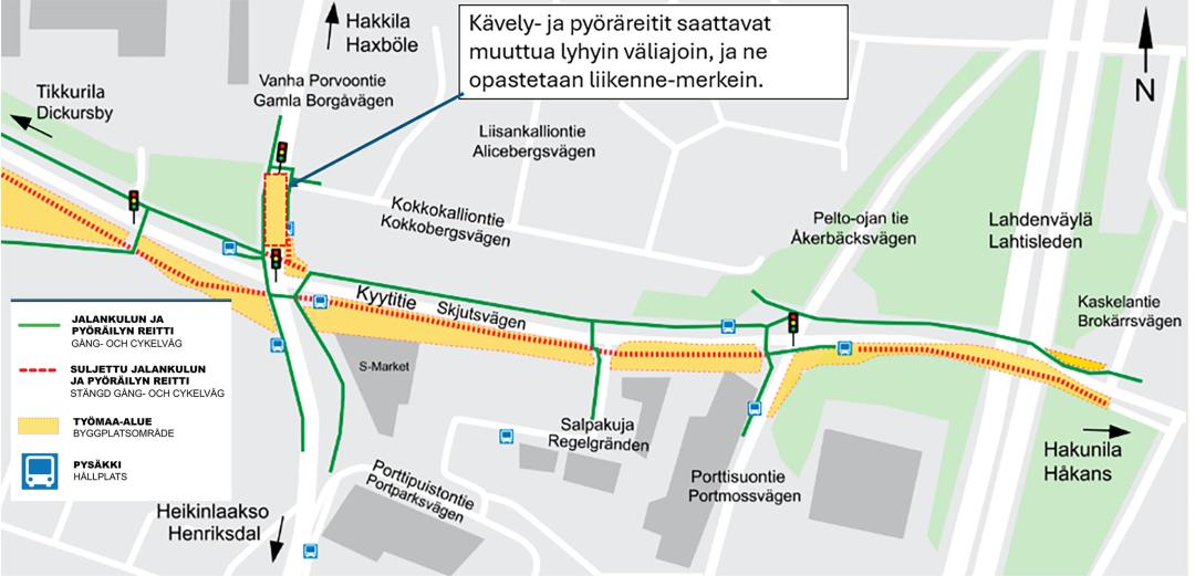 Pohjoinen suojatie suljetaan Kyytitien ja Vanhan Porvoontien risteyksessä. Vanha Porvoontien suojatie työmaa-alueen pohjoispuolella Kokkokalliontien kohdalla on käytössä.
