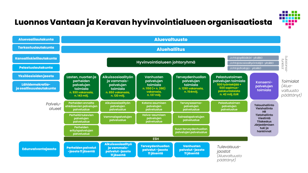 Vantaan ja Keravan hyvinvointialue vastaa 1.1.2023 alkaen Vantaan ja Keravan alueen sosiaali- ja terveyspalvelujen sekä pelastustoimen järjestämisestä. Vuoden 2022 aikana hyvinvointialueen organisaatio rakentuu vaiheittain. Tammikuussa pidettiin aluevaalit ja aluevaltuusto aloitti työnsä maaliskuussa. Aluevaltuusto on nyt asettanut aluehallituksen ja hyvinvointialuejohtajan virka on ollut haussa. Myös hyvinvointialueen organisoitumisen määrittävä hallintosääntö on hyväksytty ja hyvinvointialueen organisaatiorakenne alkaa muodostua.