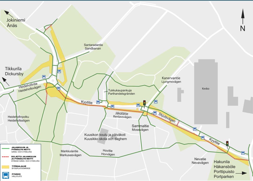 Kävely- ja pyöräreitti suljetaan Kyytitien eteläpuolella Heidehofinpuiston itäreunan ja Kanervantien välillä 1.12.2025-30.1.2026 Heidehofin liikenneympyrän itäpuolella oleva Kyytitien alikulku jää käyttöön. Kävelyn ja pyöräilyn kiertotie kulkee Kyytitien pohjoispuolella valaistua ulkoilureittiä pitkin. Tukkukaupankujan kohdalla oleva Kyytitien ylittävä suojatie jää käyttöön.