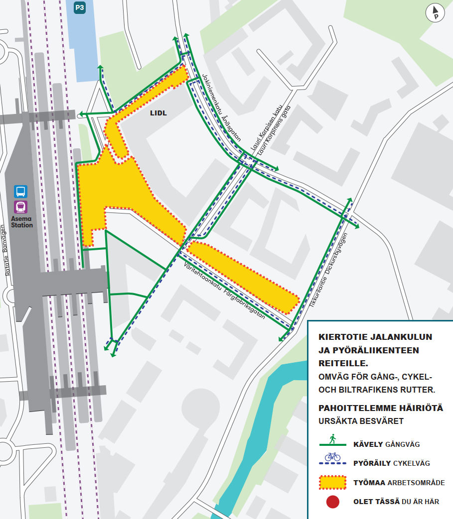Vantaan ratikan työmaat ja kulkureitit Jokiniemen puolella Tikkurilan asemaa