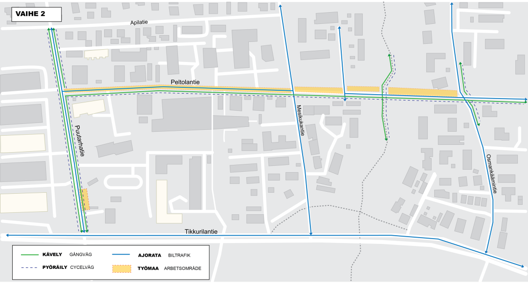 Työn aikana Peltolantie välillä Mesikukantie–Osmankäämintie joudutaan sulkemaan moottoriajoneuvoliikenteeltä kahdessa osassa, mutta tonteille ajo kuitenkin mahdollistetaan. Tarkistathan ajoreitit tiedotteen oheisista kartoista. Vaihe 1 kestää noin kaksi viikkoa ja sen jälkeen vaihe 2 toiset noin kaksi viikkoa.