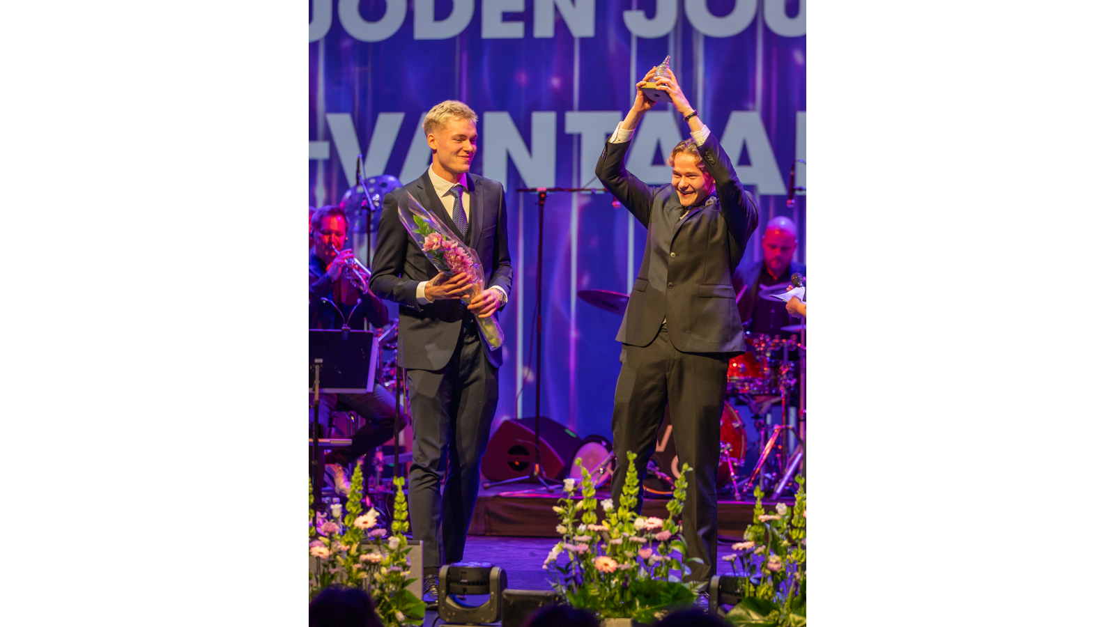 Vuoden urheilija Riku Illukka käsissään kukkakimppu ja palkinto.