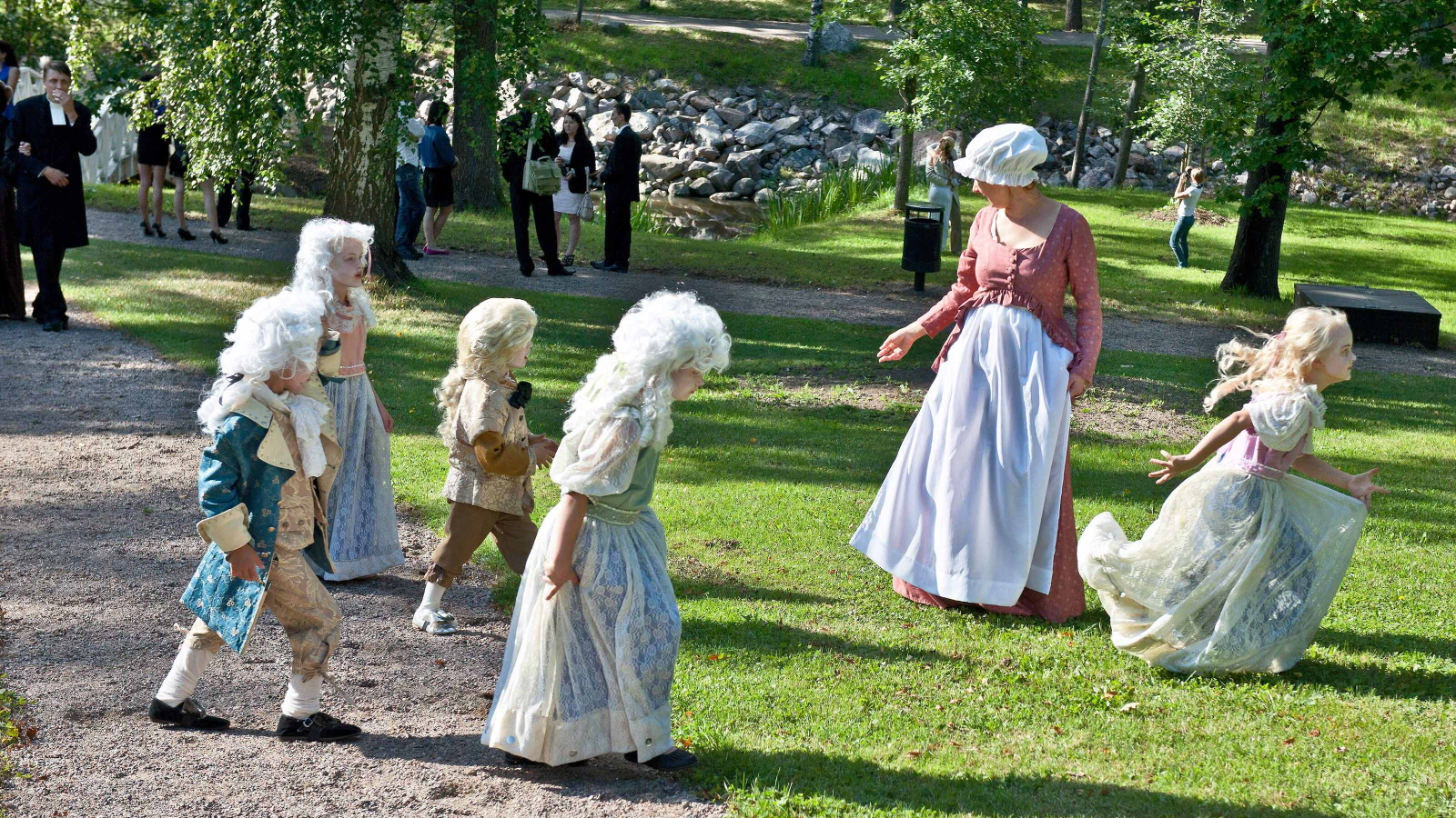 ”Kustaa III” ja ”Johan Sederholm” tervehtivät toisiaan Håkansbölen kartanopuiston avajaisissa vuonna 2011. Kuva: Pekka J. Heiskanen, Vantaan kaupunginmuseo