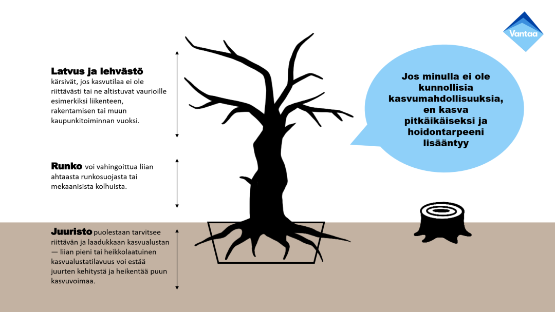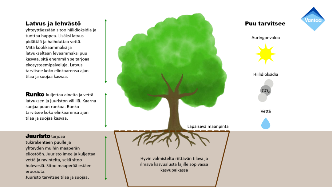 Tiivistyvien keskustojen kaupunkivihreän ja ekosysteemipalveluiden turvaaminen edellyttää sekä nykyisen että istutettavan puuston elinvoimaisuuden ja pitkäikäisyyden voimakkaampaa tukemista.