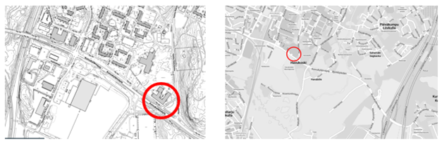 Kartoissa merkitty Kytöpuiston koulupaviljongin sijainti Koivukylänväylän vieressä