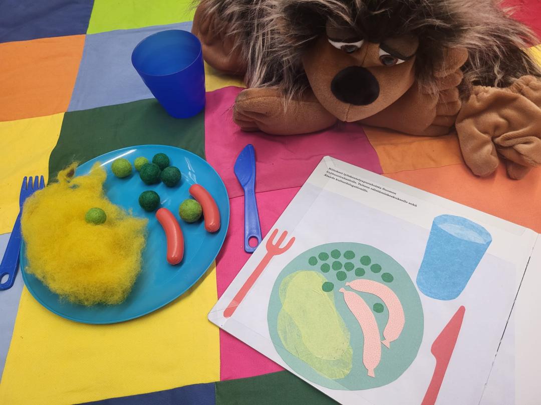 2. Tarinaa olisi hyvä konkretisoida eri aistien kautta: äänin, liikkein ja rekvisiitalla. Tarinassa voi olla esimerkiksi eläimiä, jotka löytyvät helposti käsinukkeina tai pehmoleluina, asioita tai eläimiä, joiden ääniä tai liikettä on helppo matkia yhdessä tai toimintaa, jota lapset voivat kokeilla myös itse. Myös ilmeikkäät kuvat, joiden tunnetilasta voidaan keskustella, toimivat hyvin.