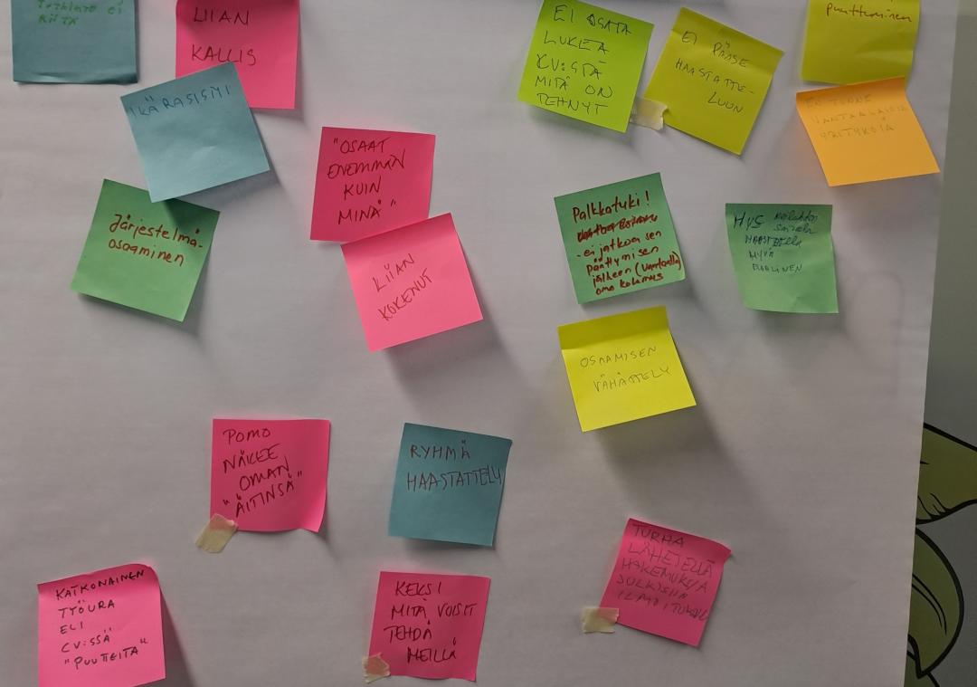 Esille nousi myös vertaistuen puuttuminen. Työnhaku on usein yksinäistä ja vertaisryhmältä voi saada tuen lisäksi myös ideoita uusista työpaikoista.