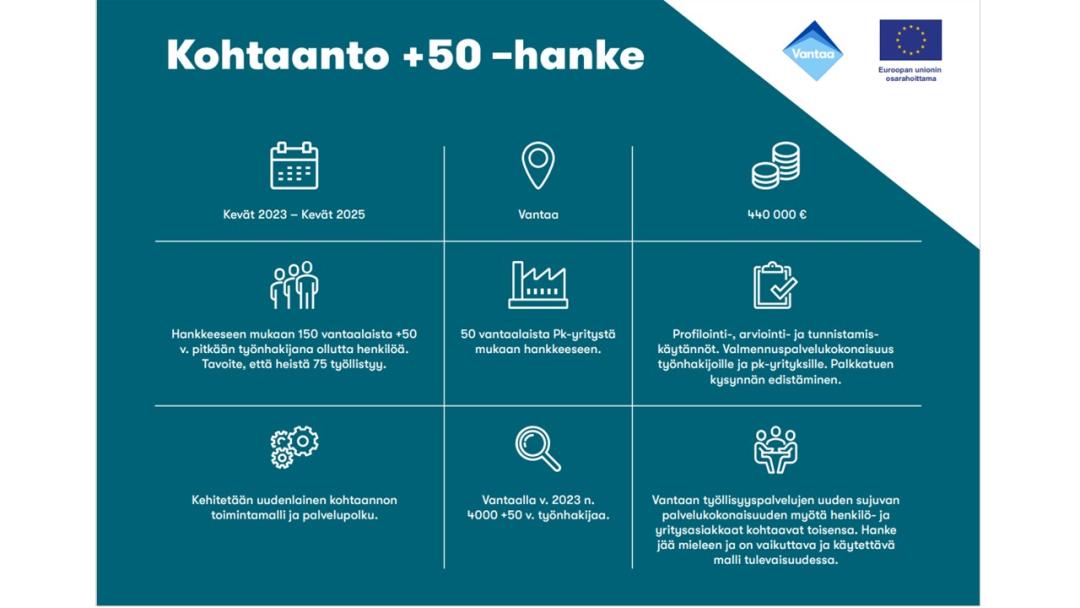 Kohtaanto +50 -hanke pyrki auttamaan sekä 50 vuotta täyttäneitä työnhakijoita että pieniä ja keskisuuria yrityksiä. Hankkeessa pyrittiin vaikuttamaan 50 vuotta täyttäneiden rekrytointiin muun muassa nostamalla esiin tämän ikäisten työntekijöiden palkkaamisen hyviä puolia toteuttamalla somekampanja kaksi kertaa.