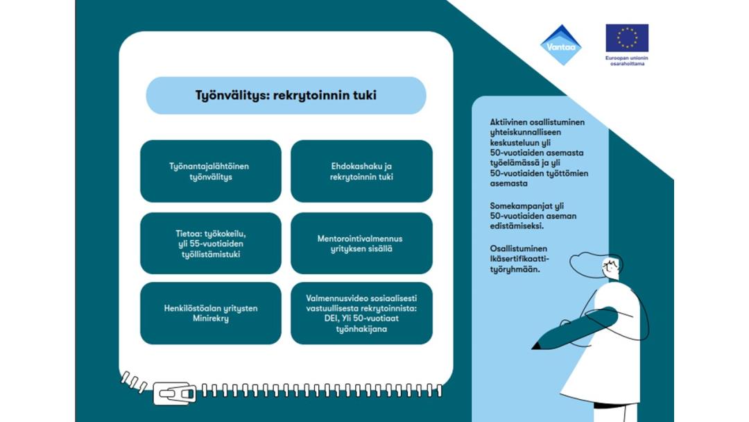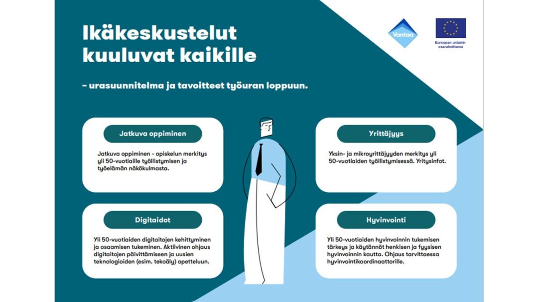 Pk-yrityksille tarjottiin rekrytointi- ja mentorointitaitojen oppimista ja kehittämistä sekä ikämoninaisen johtamisen taitoja. Lisäksi yrityksen saivat tietoa Vantaan tarjoamista palveluista ja taloudellisista tukimuodoista yrityksille.