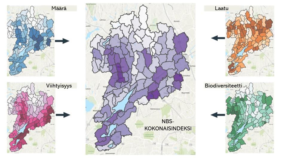 Kuva 1. NBS-kokonaisindeksin eli kokonaispriorisoinnin muodostuminen neljästä osapriorisoinnista Pitkäjärven valuma-alueella. Tummempi väri kuvaa korkeampaa prioriteettia.