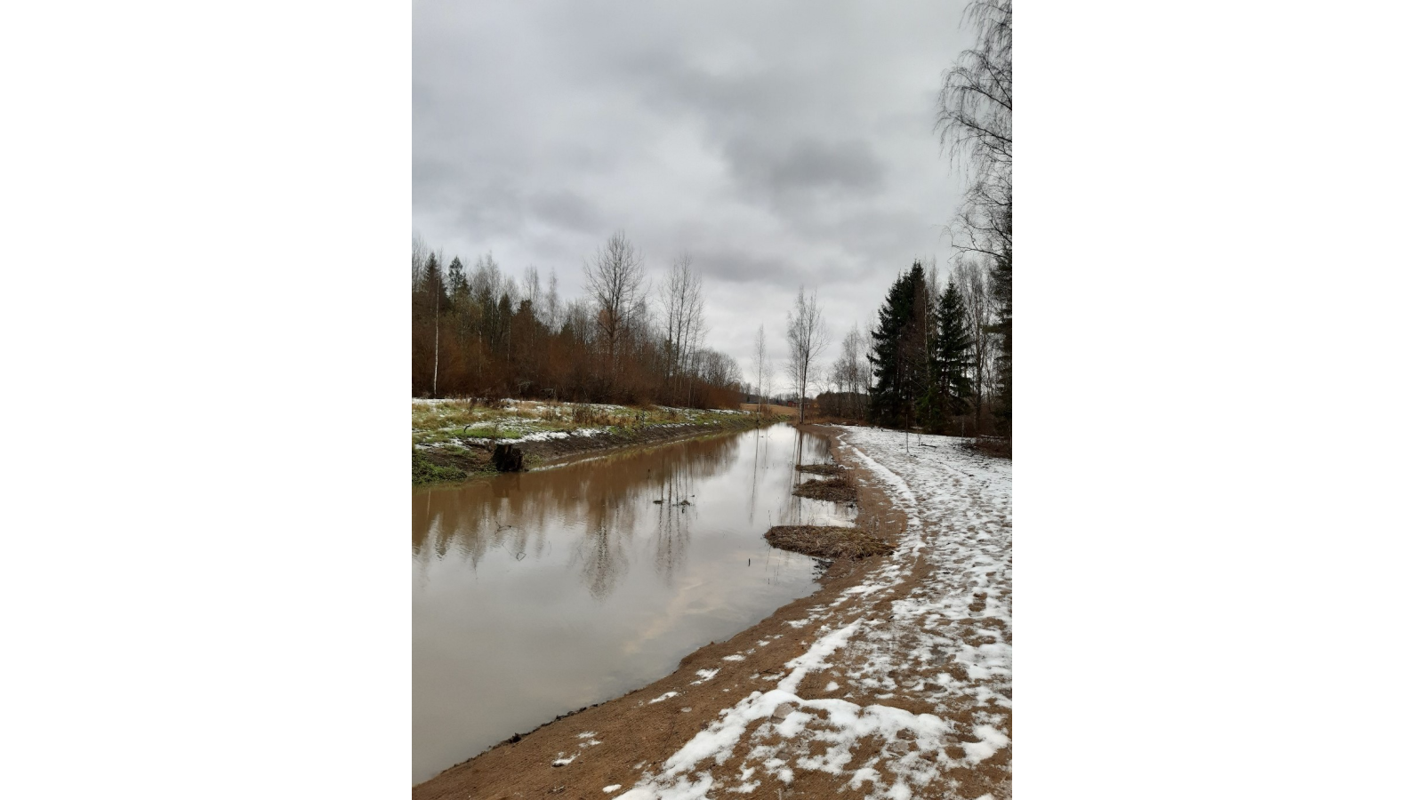 Pitkäjärven valuma-alueella tulvavedestä täyttyy muun muassa Hermanskärinniitty, joka on normaalisti viljelykäytössä olevaa peltoa. Myös muualla teillä ja nurmialueilla tulvii. Kuvat: Tero Toivola.
